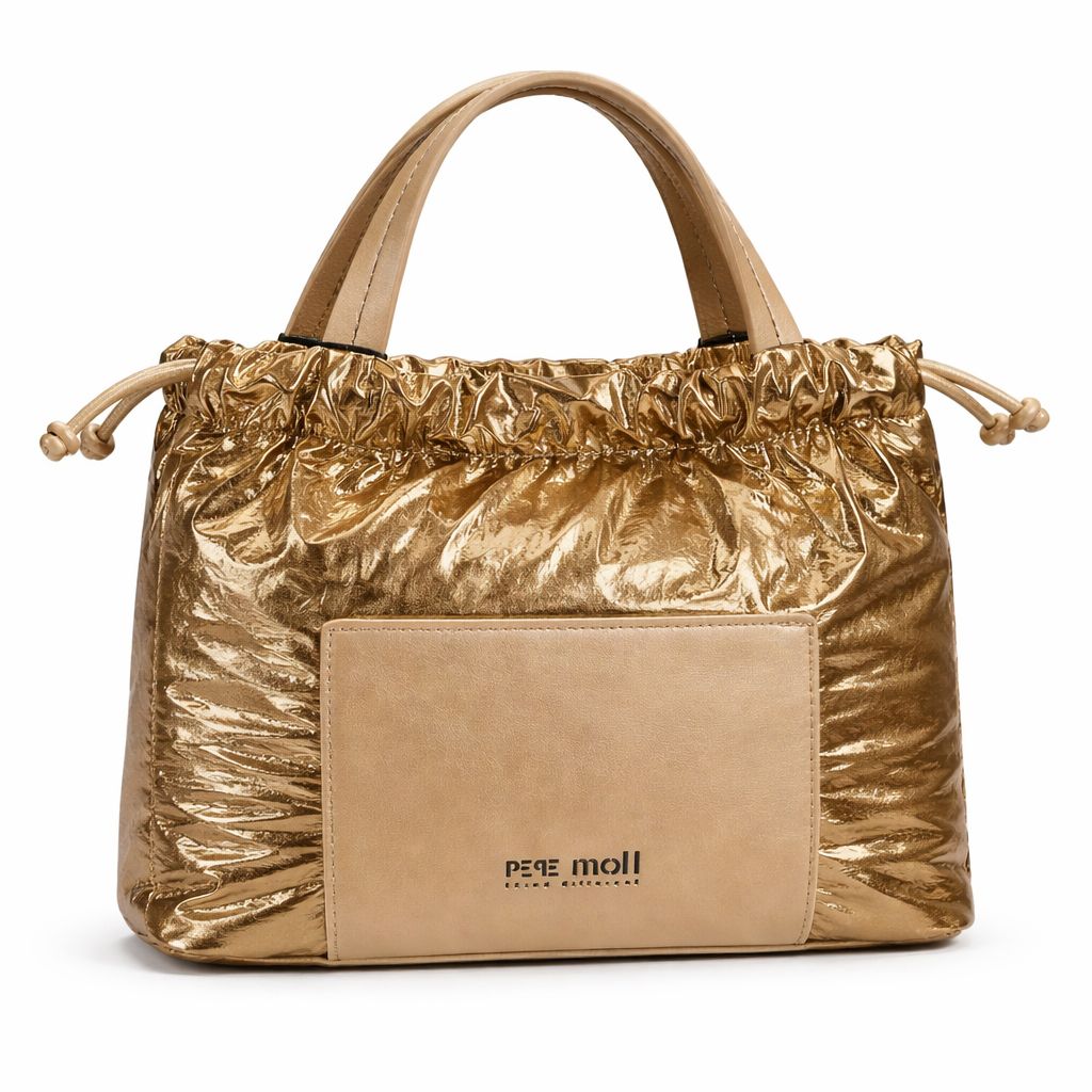Kvalitná kabelka od značky PEPE MOLL. Model v zlatej farbe. Zvršok vyrobený z kvalitného textilného materiálu a ekokože.