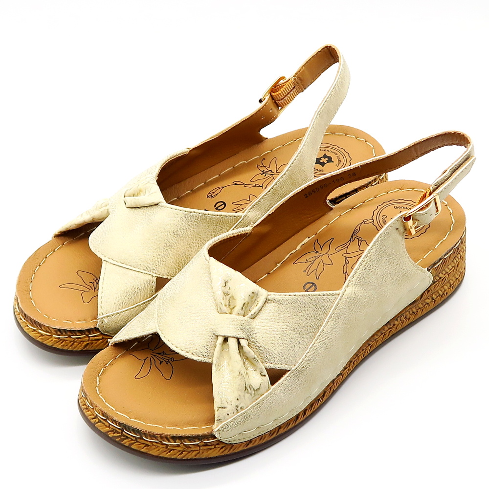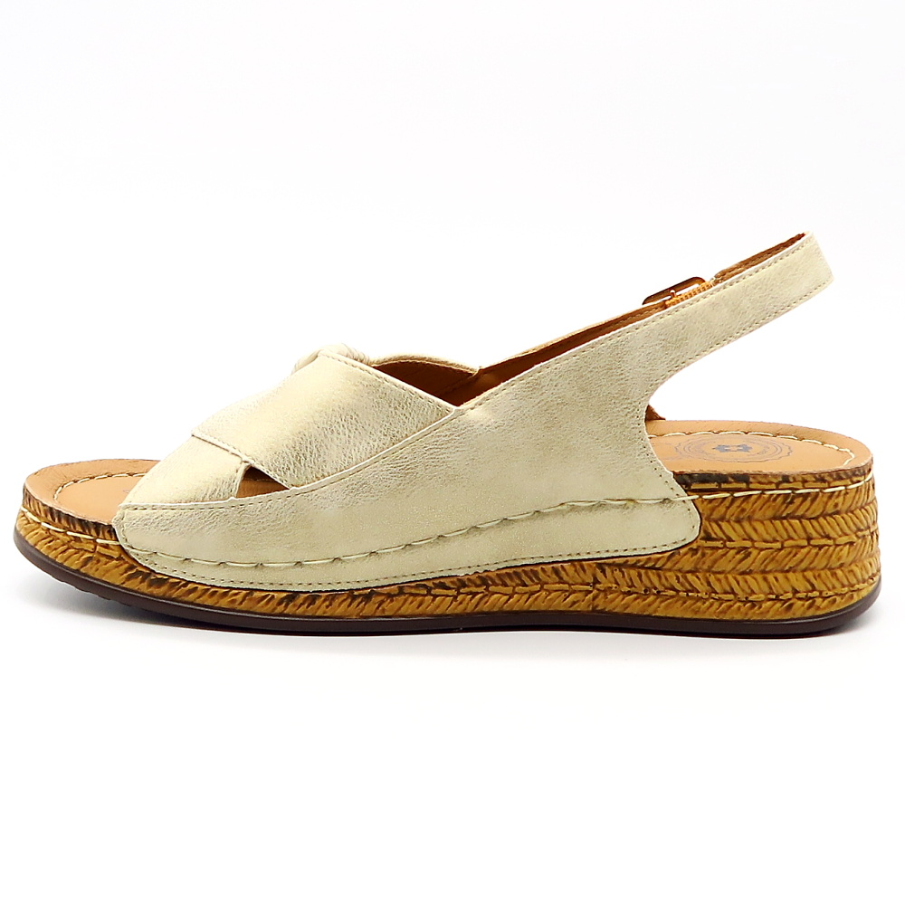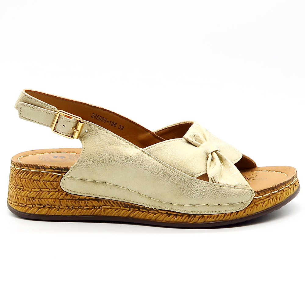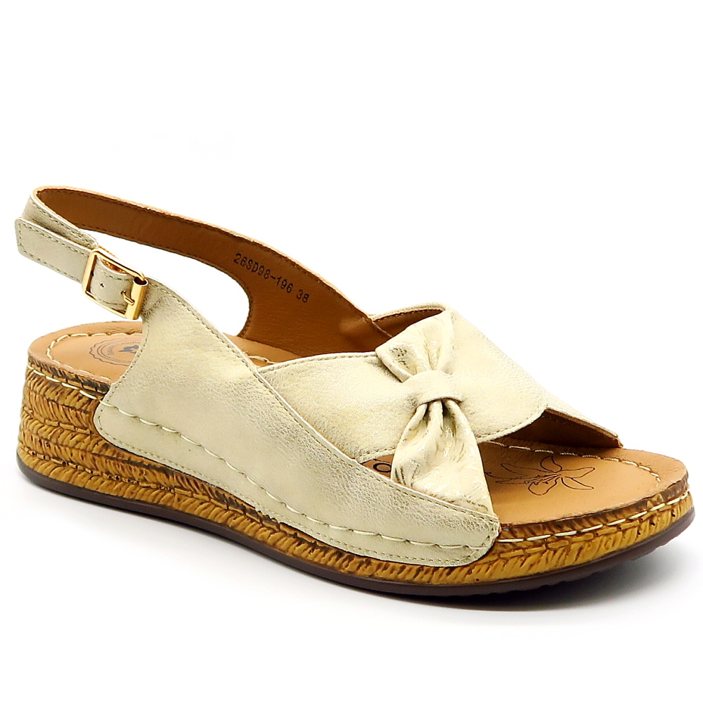 Praktické letné sandále značky EVENTO. Model v zlatej farbe s jemným odleskom. Zvršok vyrobený z ekologickej kože. Pekne strihaná predná časť zdobená mašľou, ktorá dodá celému modelu eleganciu. Sandále vhodné aj na širšie chodidlá. Výhodou tohto modelu je mäkká kožená stielka a vyvýšená podrážka.