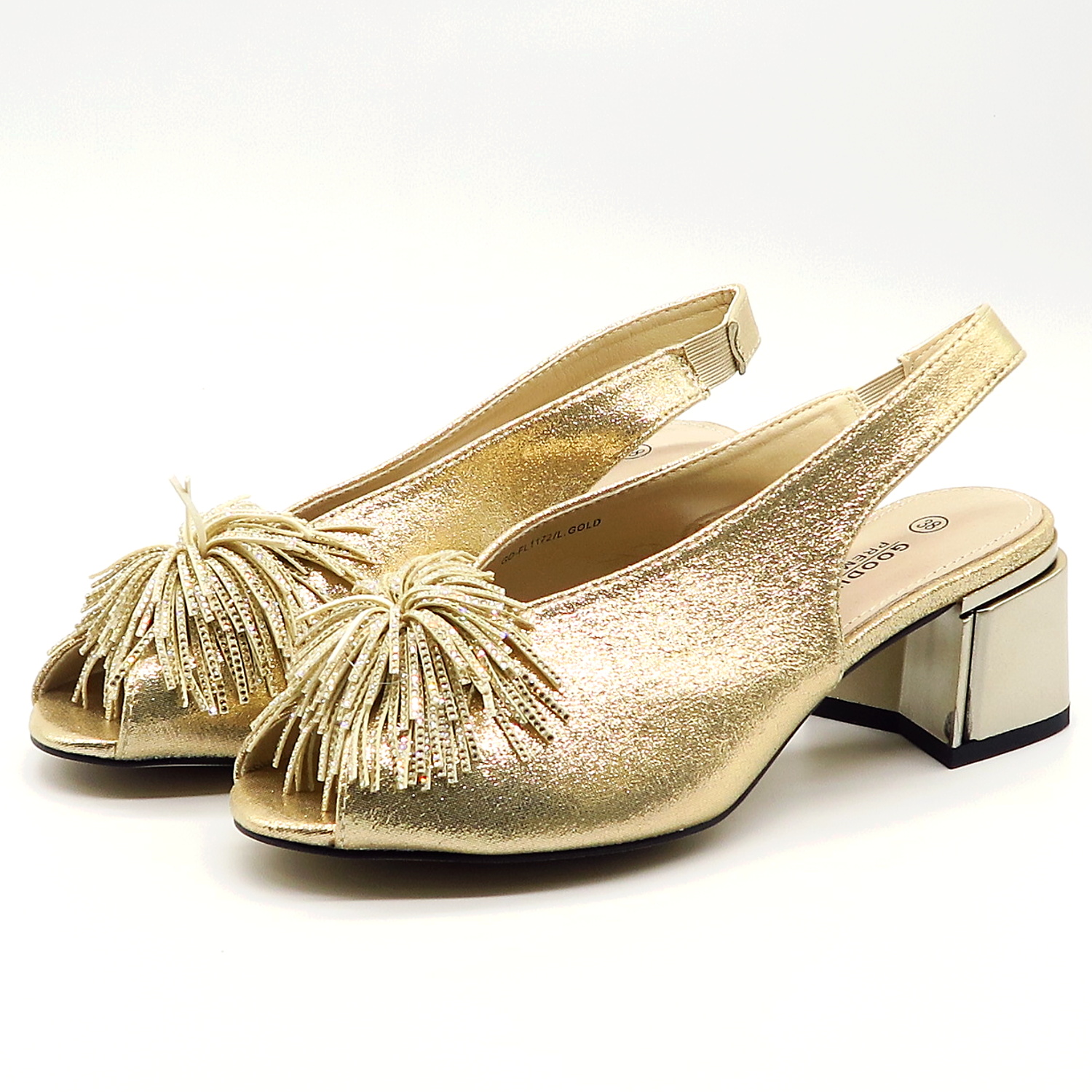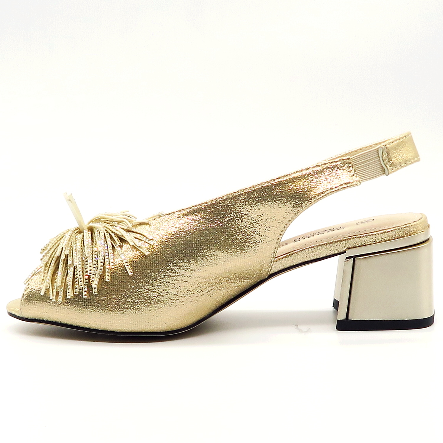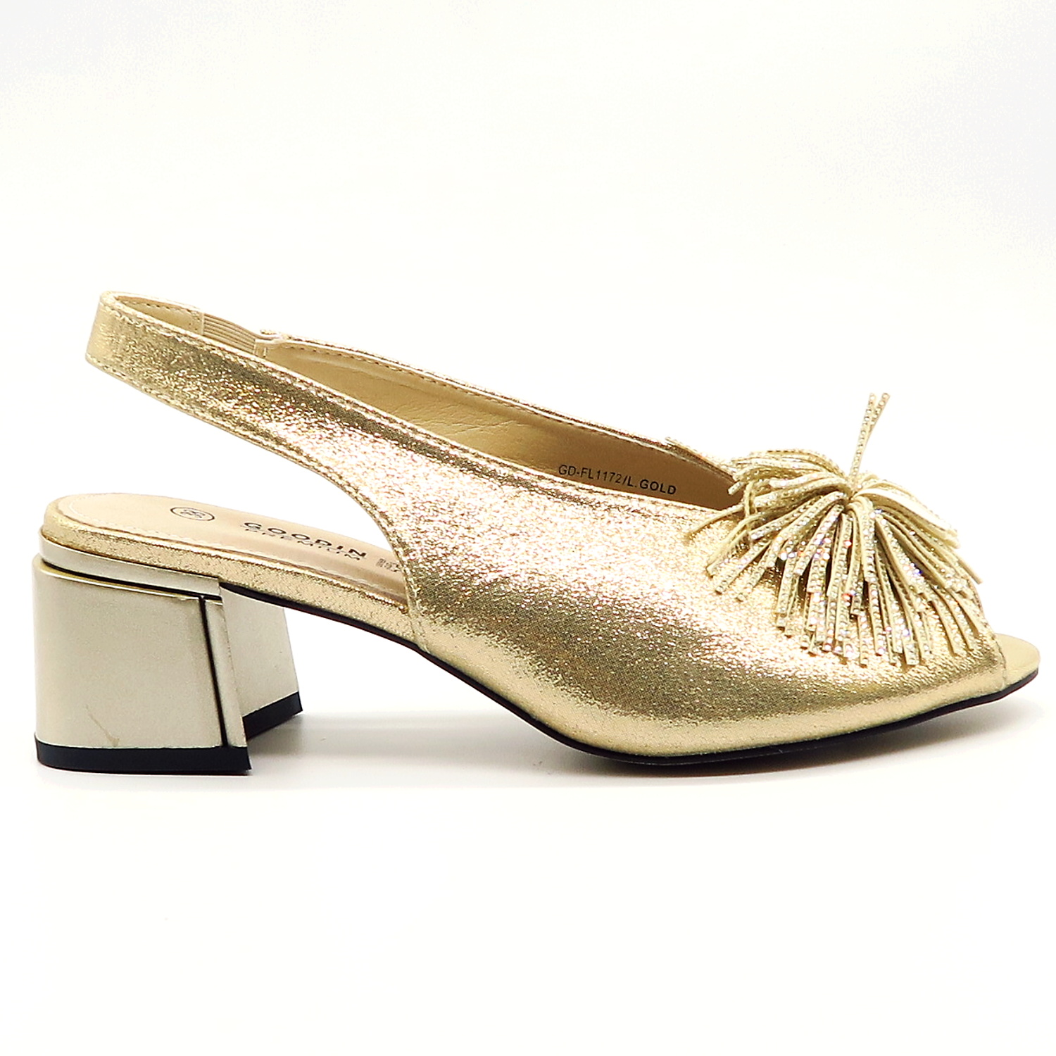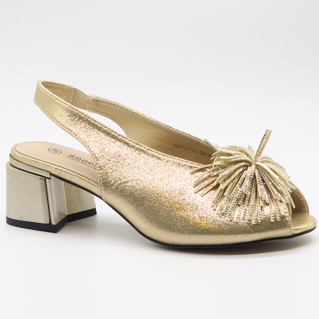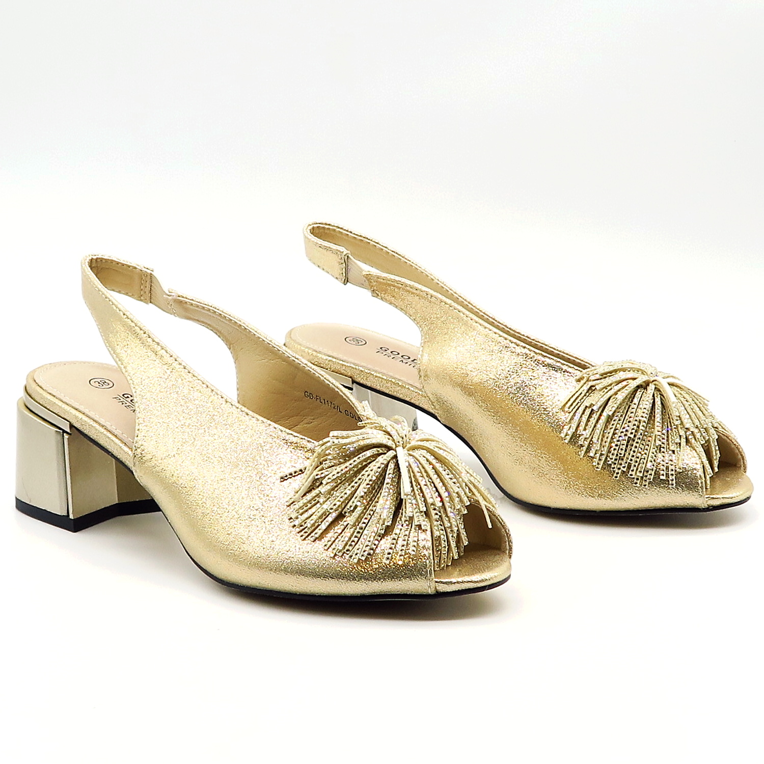 Elegantné dámske sandále v jemnom zlatom prevedení, ktoré pôsobí luxusne a slávnostne. Model má otvorenú špičku s výraznou ozdobnou aplikáciou z kamienkov, ktorá vytvára efektný a originálny detail. Otvorená päta s ramienkom zabezpečuje pohodlné obúvanie a dobré držanie nohy. Sandále sú na stabilnom nízkom podpätku, vďaka čomu sú vhodné aj na dlhšie nosenie. Ideálna voľba na svadby, oslavy, spoločenské udalosti alebo ako elegantný doplnok k letným šatám.