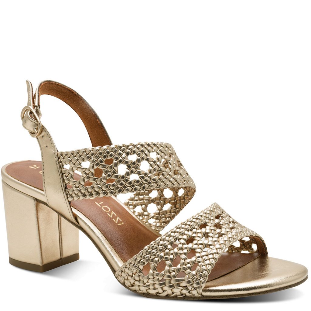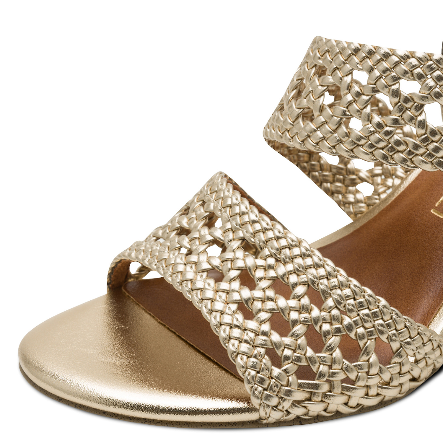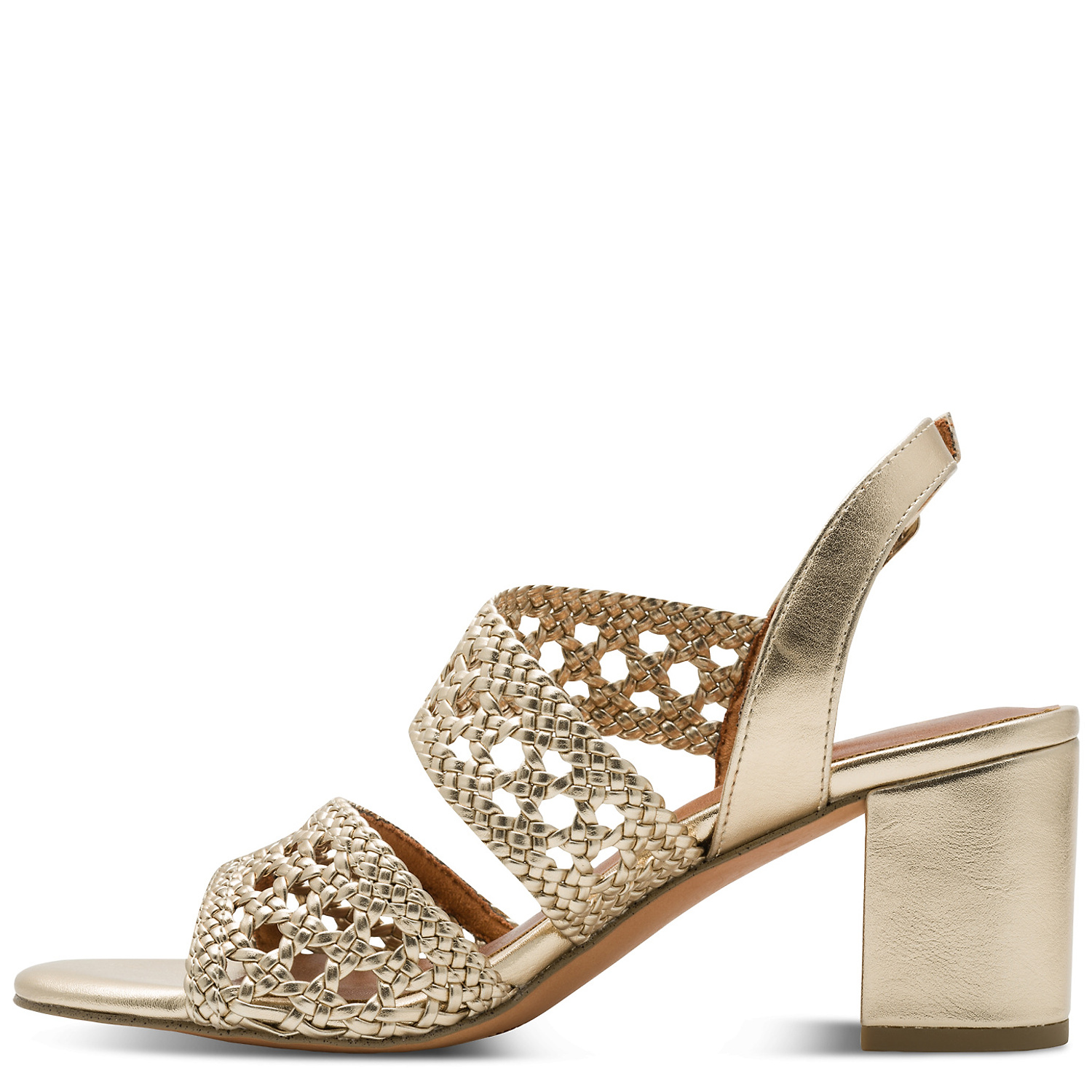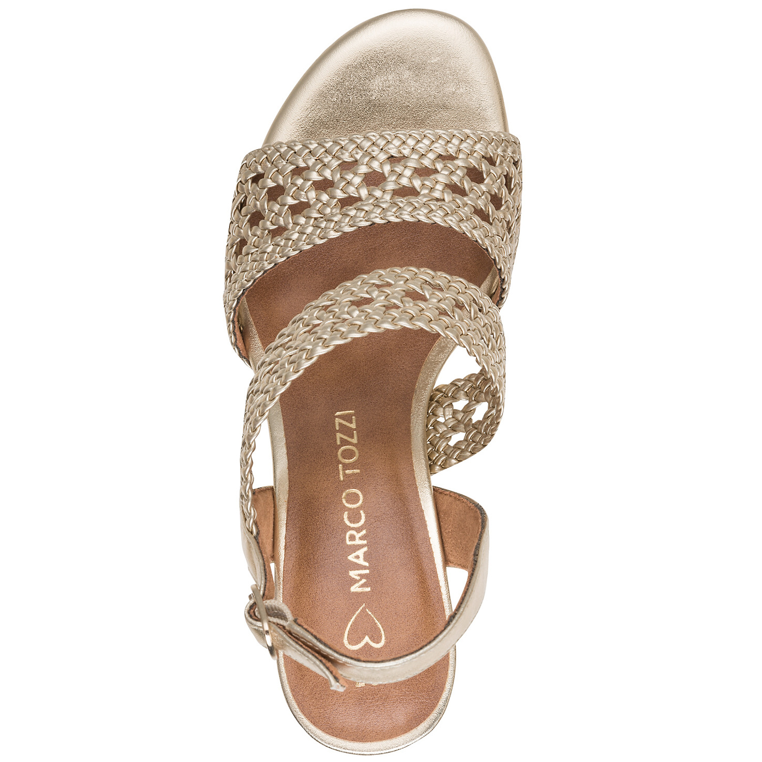 Dámske sandále MARCO TOZZI v elegantnom zlatom prevedení sú ideálnou voľbou na leto, spoločenské udalosti aj bežné nosenie. Zvršok je vyhotovený z jemne pleteného materiálu, ktorý pôsobí vzdušne a štýlovo, zároveň sa pohodlne prispôsobí chodidlu. Sandále majú stabilný hrubší podpätok, ktorý dodáva eleganciu, no zároveň zabezpečuje komfort pri chôdzi. Mäkká stielka zvyšuje pohodlie aj pri dlhšom nosení.