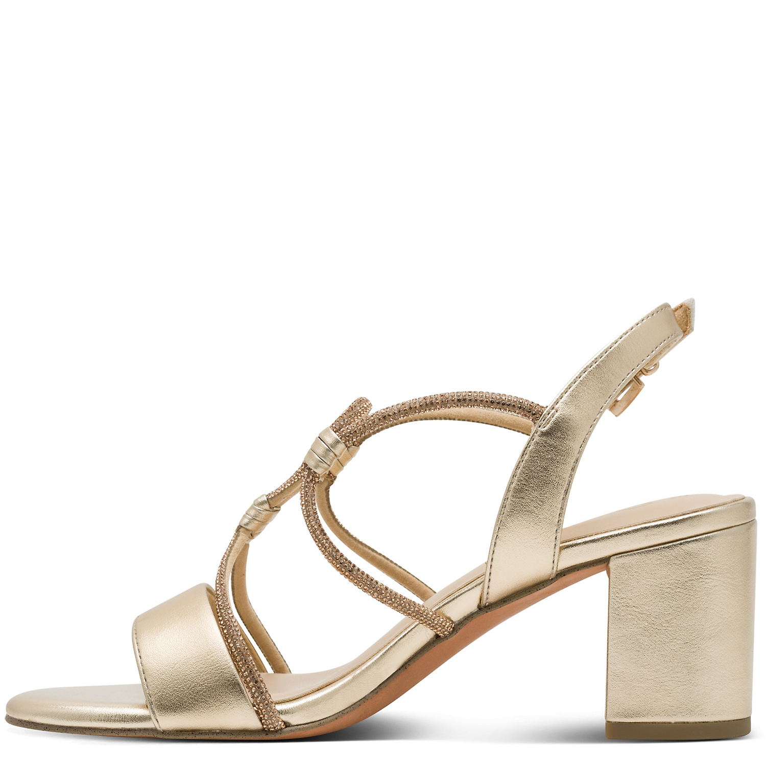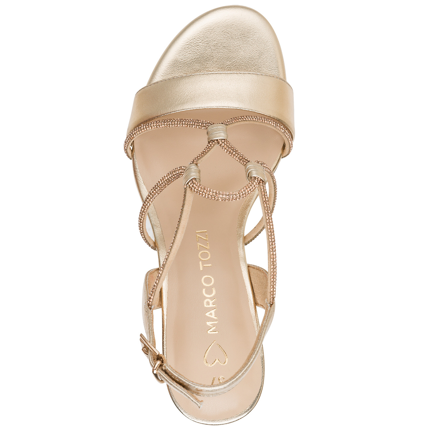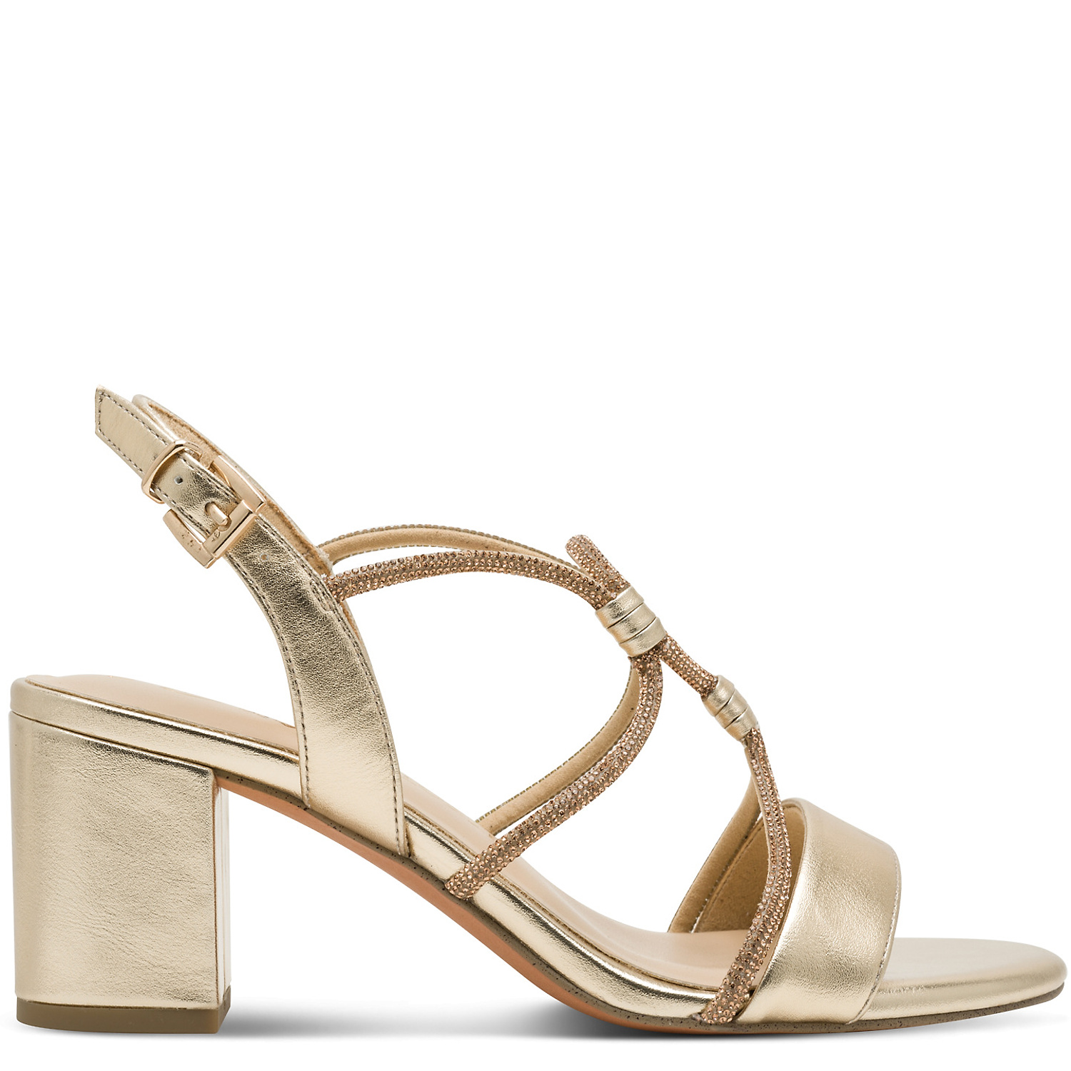 Dámske sandále MARCO TOZZI sú elegantným doplnkom na spoločenské udalosti aj letné večery. Jemný zlatistý odtieň v kombinácii s tenkými ramienkami zdobenými decentnými kamienkami dodáva obuvi luxusný a ženský vzhľad. Stabilný hrubší podpätok zabezpečuje pohodlie a istotu pri chôdzi, zatiaľ čo otvorená špička a nastaviteľný ramienok okolo päty s prackou sa postarajú o dokonalé prispôsobenie nohe. Sandále sa jednoducho kombinujú so šatami, sukňami aj elegantnými nohavicami a krásne dotvoria každý slávnostný outfit.