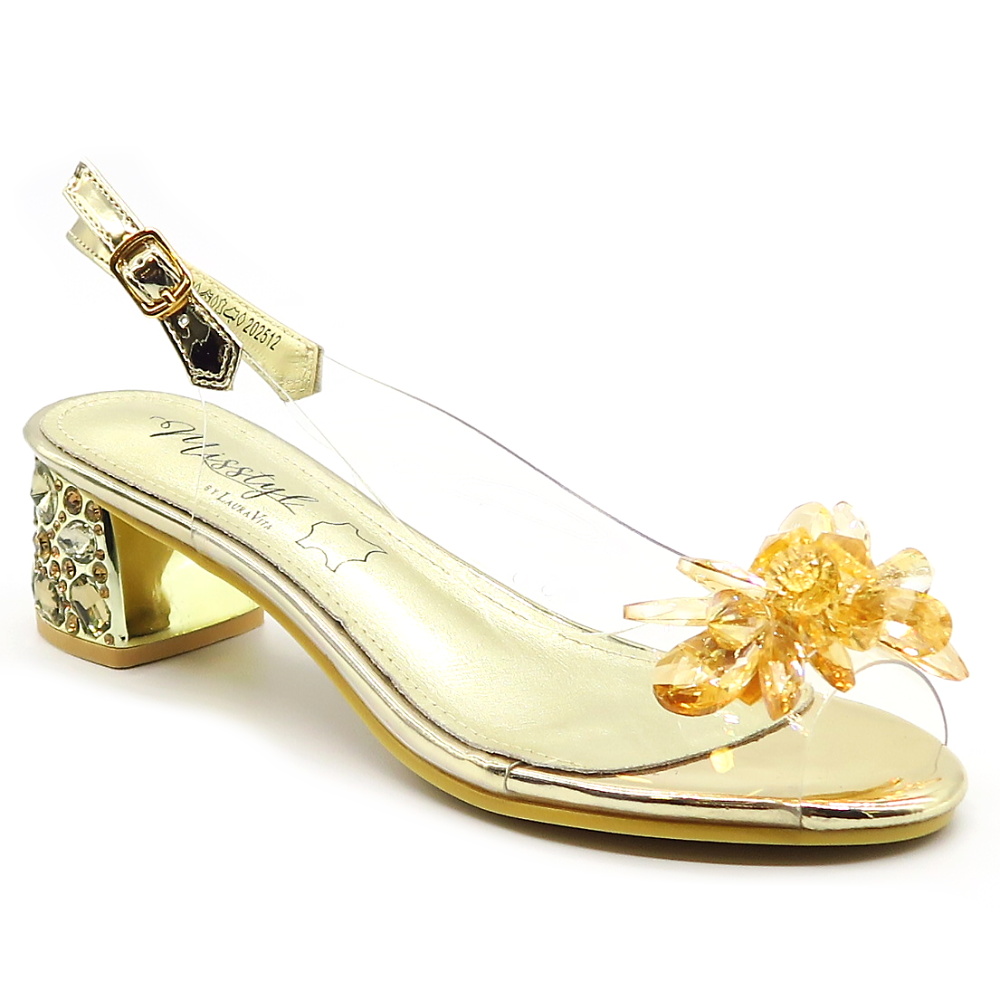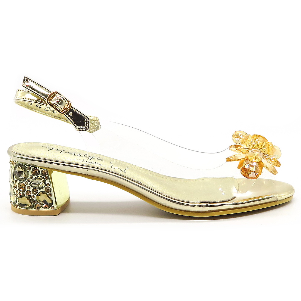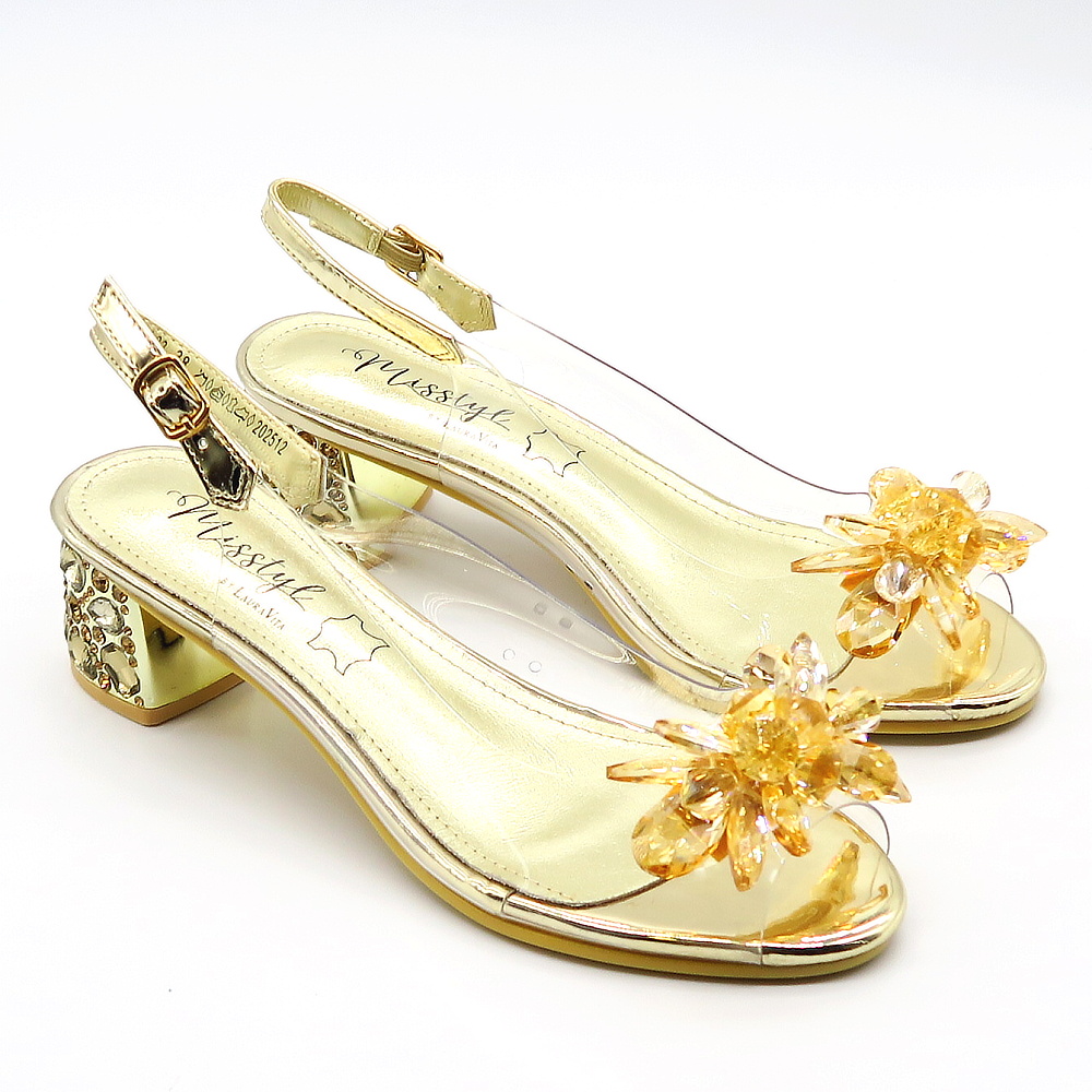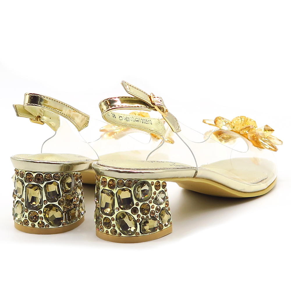Očarujúce sandále, ktoré spájajú jemnosť a noblesu v jednom. Tento model vyniká elegantnou zlatou farbou a zrkadlovým leskom. Predná časť je zdobená lesklými kryštálikmi. Transparentný materiál pôsobí nenápadne a vytvára moderný efekt. Pásik okolo členka je vybavený nastaviteľnou prackou, vďaka čomu sa dokonale prispôsobí každej nohe a poskytuje stabilitu. Pekný nízky podpätok zaručí komfortný krok.