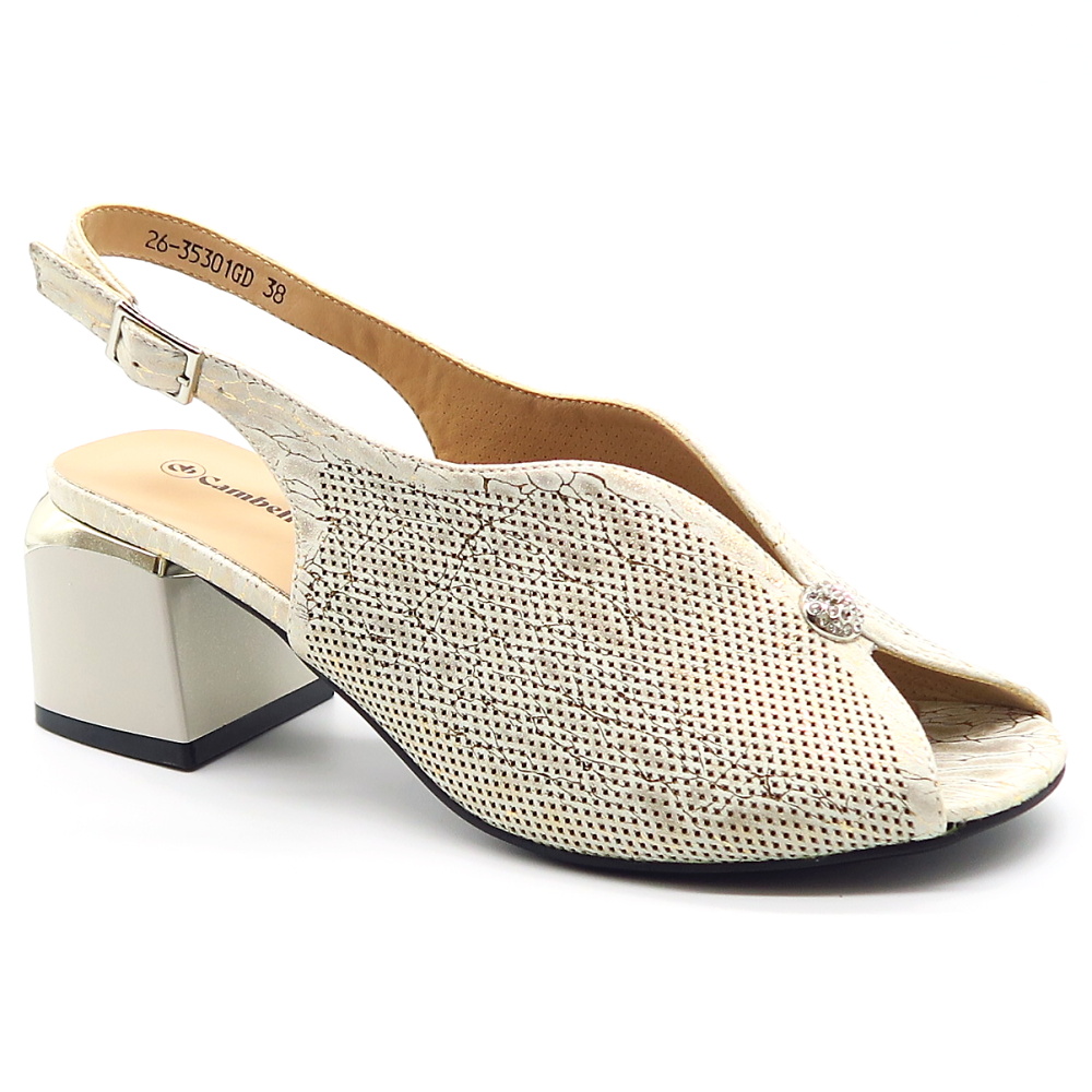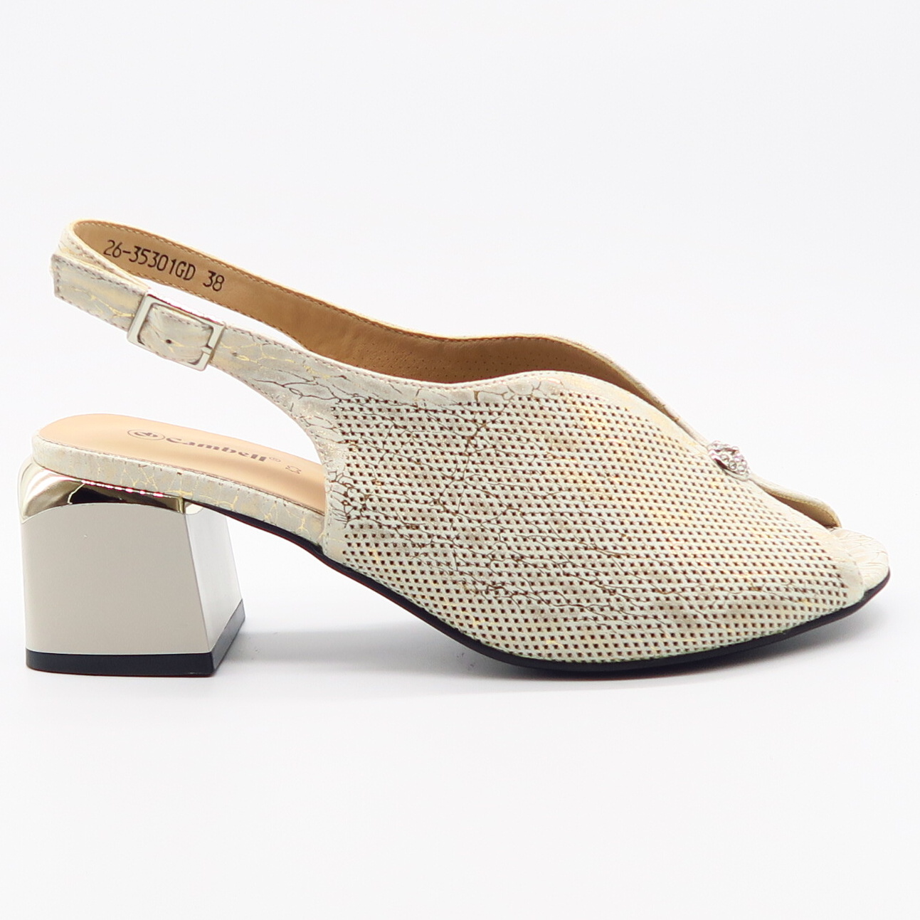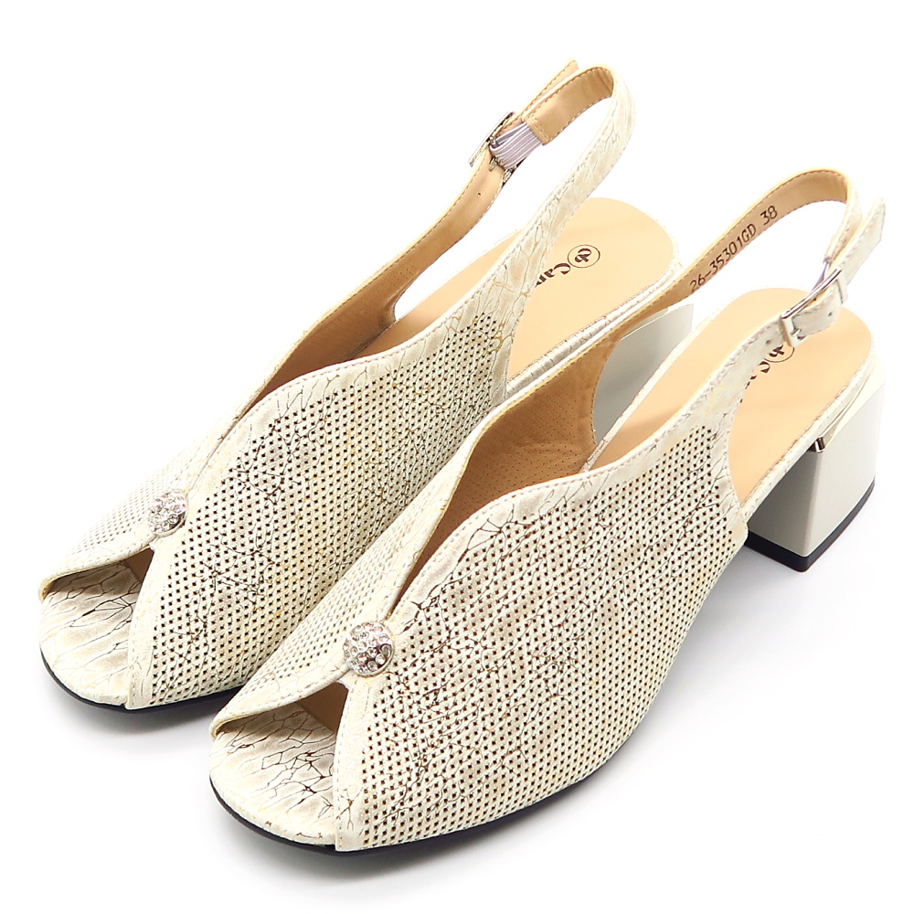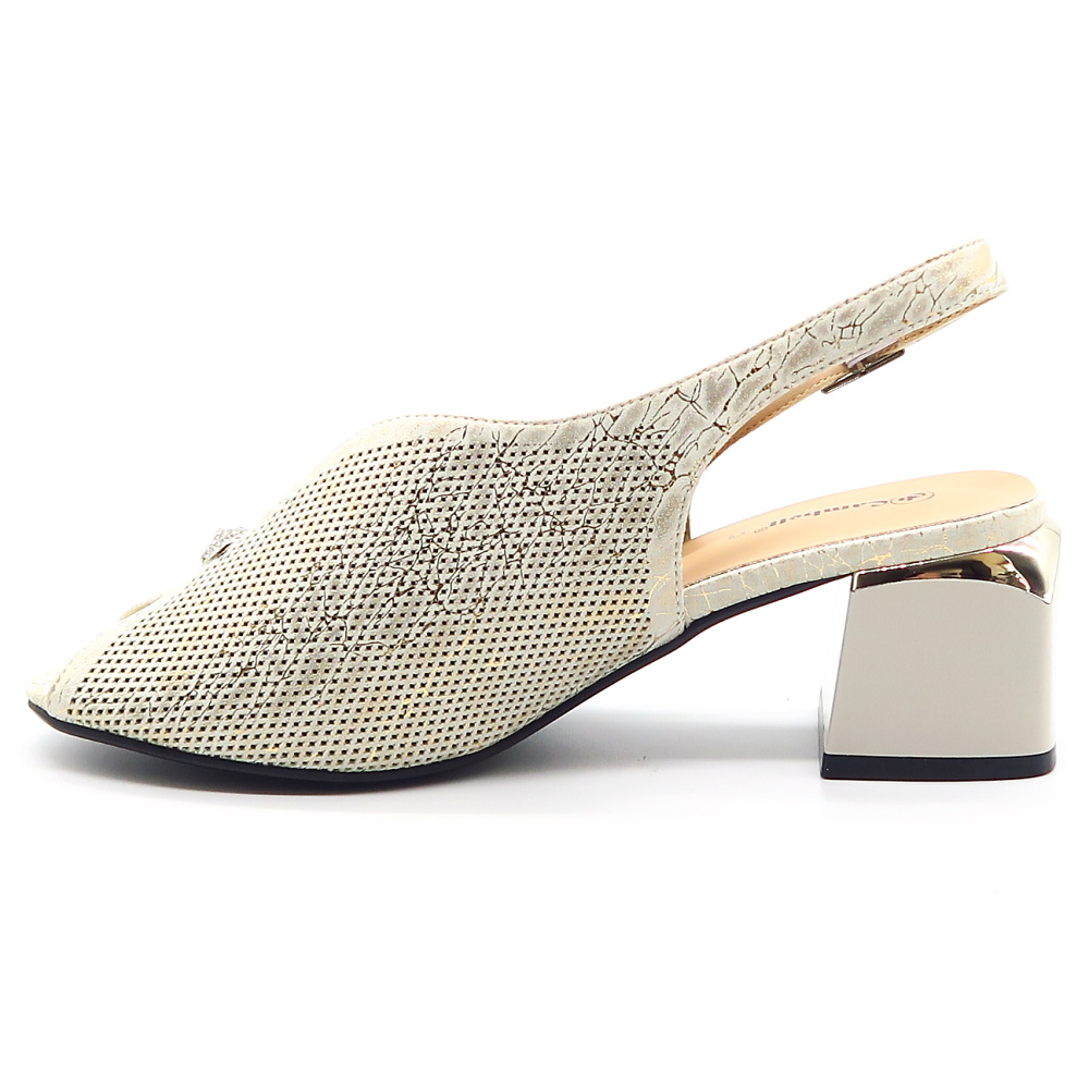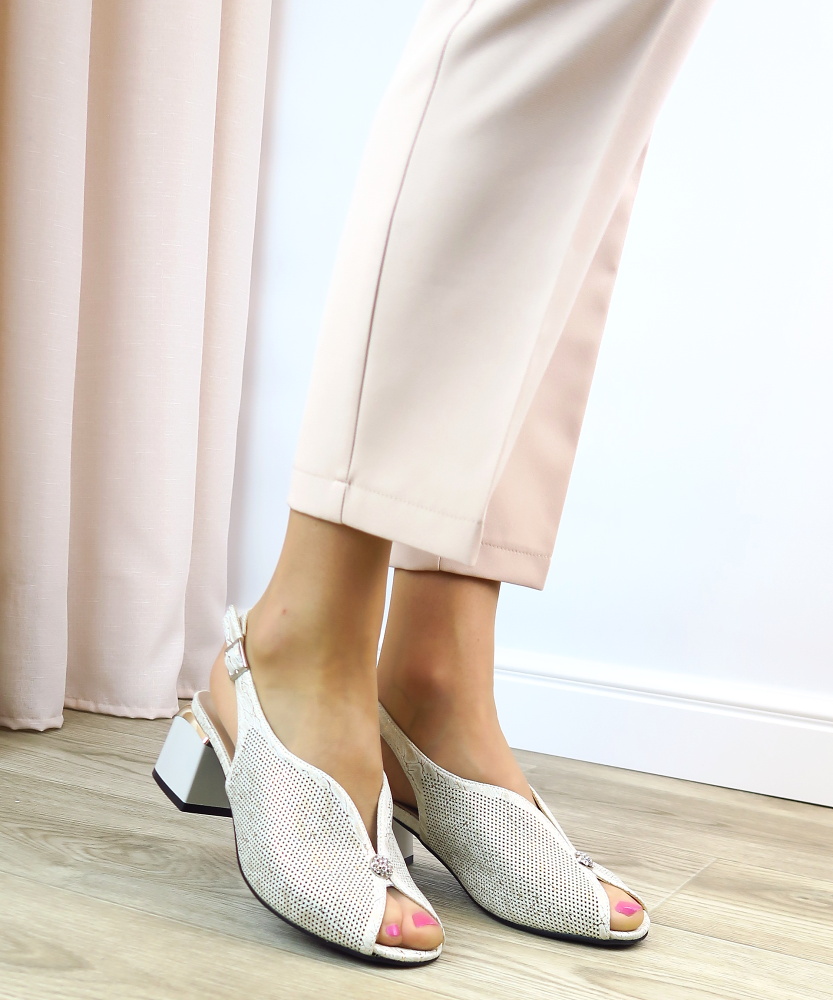 Elegantné dámske sandále v jemnom zlatom odtieni sú ideálnou voľbou na letné dni aj spoločenské príležitosti. Ich perforovaný zvršok zabezpečuje priedušnosť a pohodlie počas celého nosenia, zatiaľ čo decentný vzor decentný vzor dodáva topánkam originálny a sofistikovaný vzhľad. Sandále majú otvorenú špičku a praktický ramienok okolo päty. Jemný ozdobný detail na prednej časti podčiarkuje ich ženský štýl.