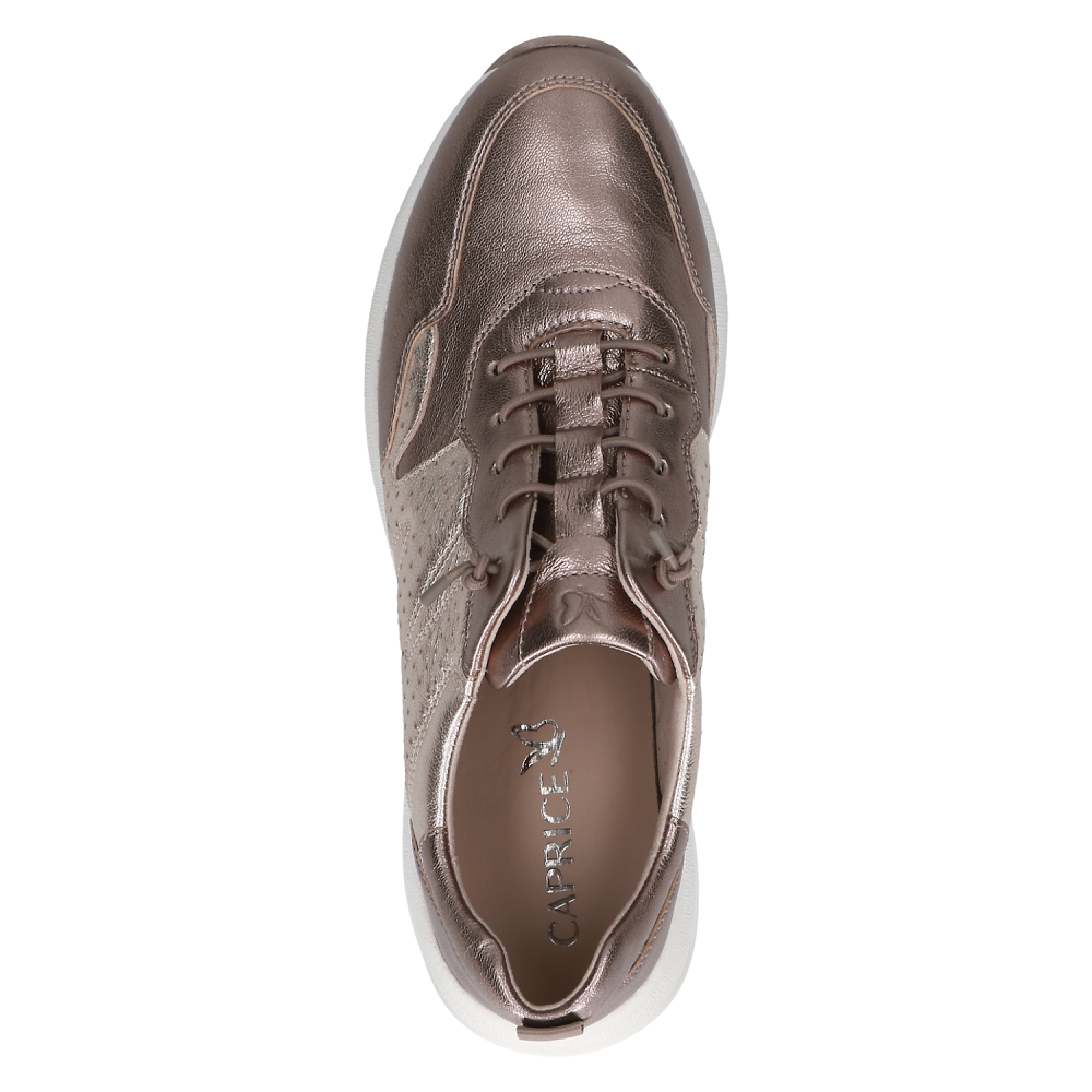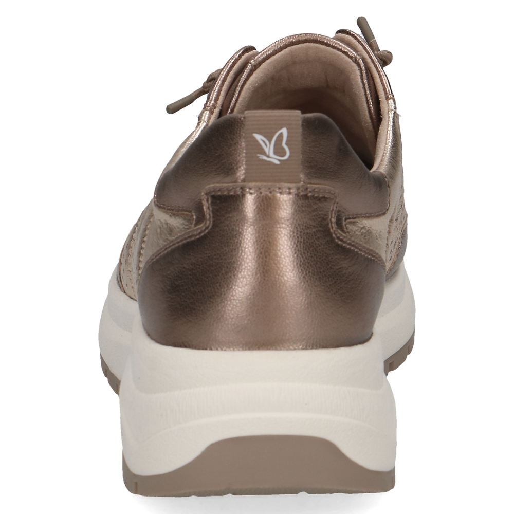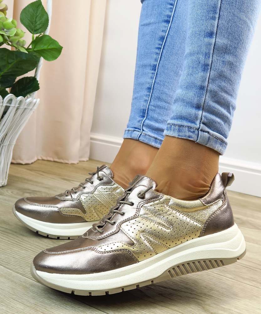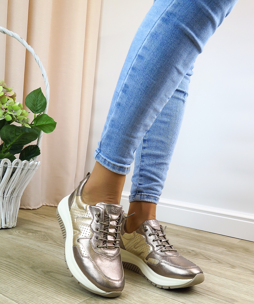 Dámske sneakersy nemeckej značky CAPRICE. Model v krásnej metalickej zlatej farbe, ktorá oživí nejeden outfit. Zvršok vyrobený z prírodnej kože. Prešívanie zvýrazňuje jednotlivé diely a dodáva obuvi upravený vzhľad. Tenisky sú vybavené elastickým šnurovaním pre dobré prispôsobenie chodidlu a ľahšie obúvanie. Vnútorná mäkká stielka poskytuje pohodlie aj pri dlhšej chôdzi. Stabilná, mierne zvýšená podrážka ponúka dobrú oporu a tlmenie pri došľape.