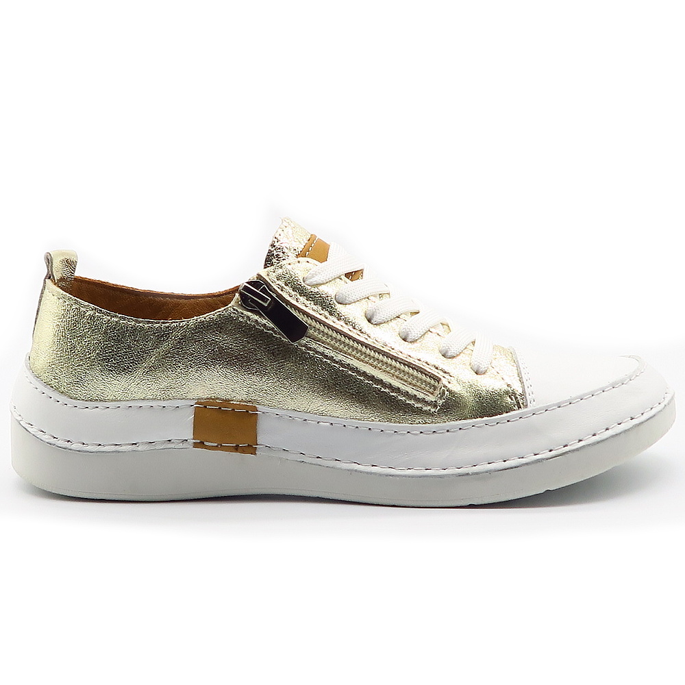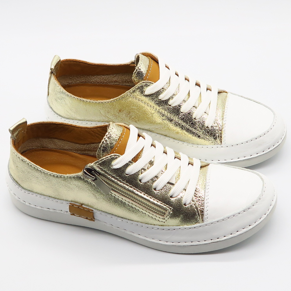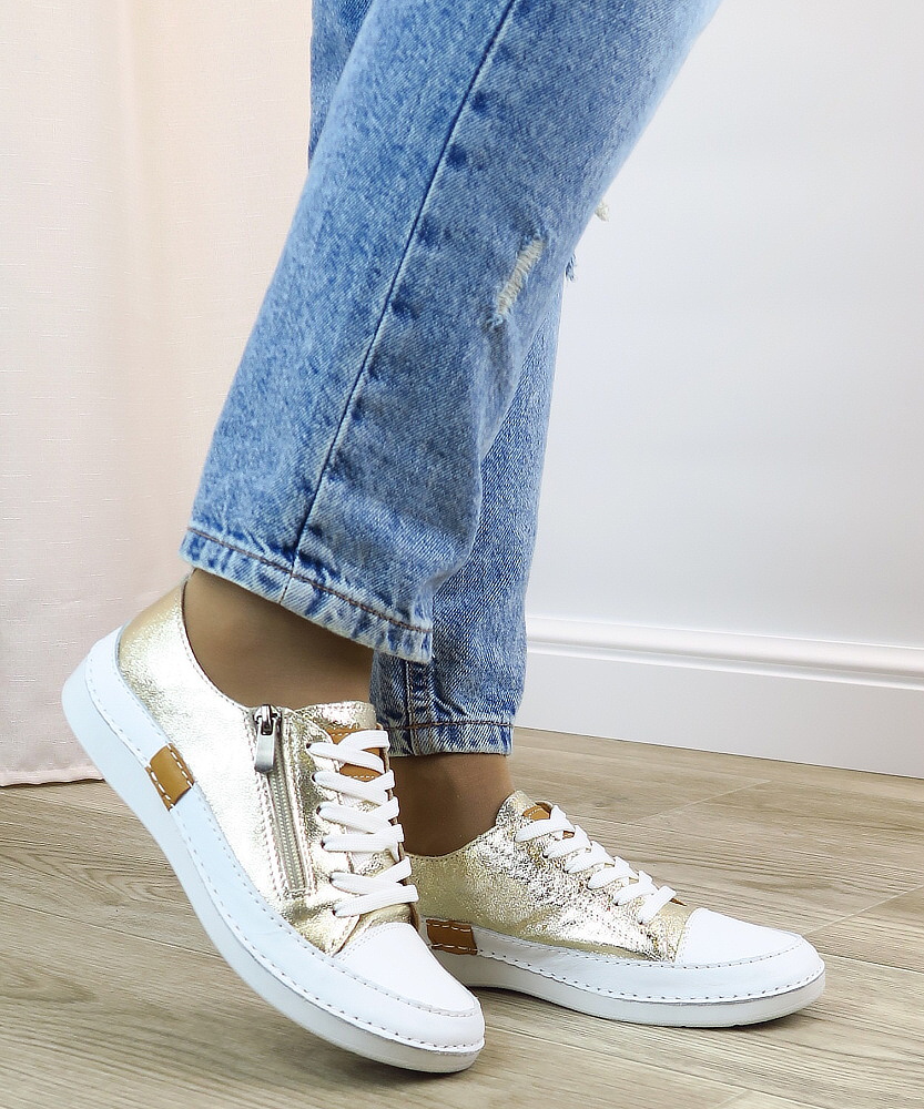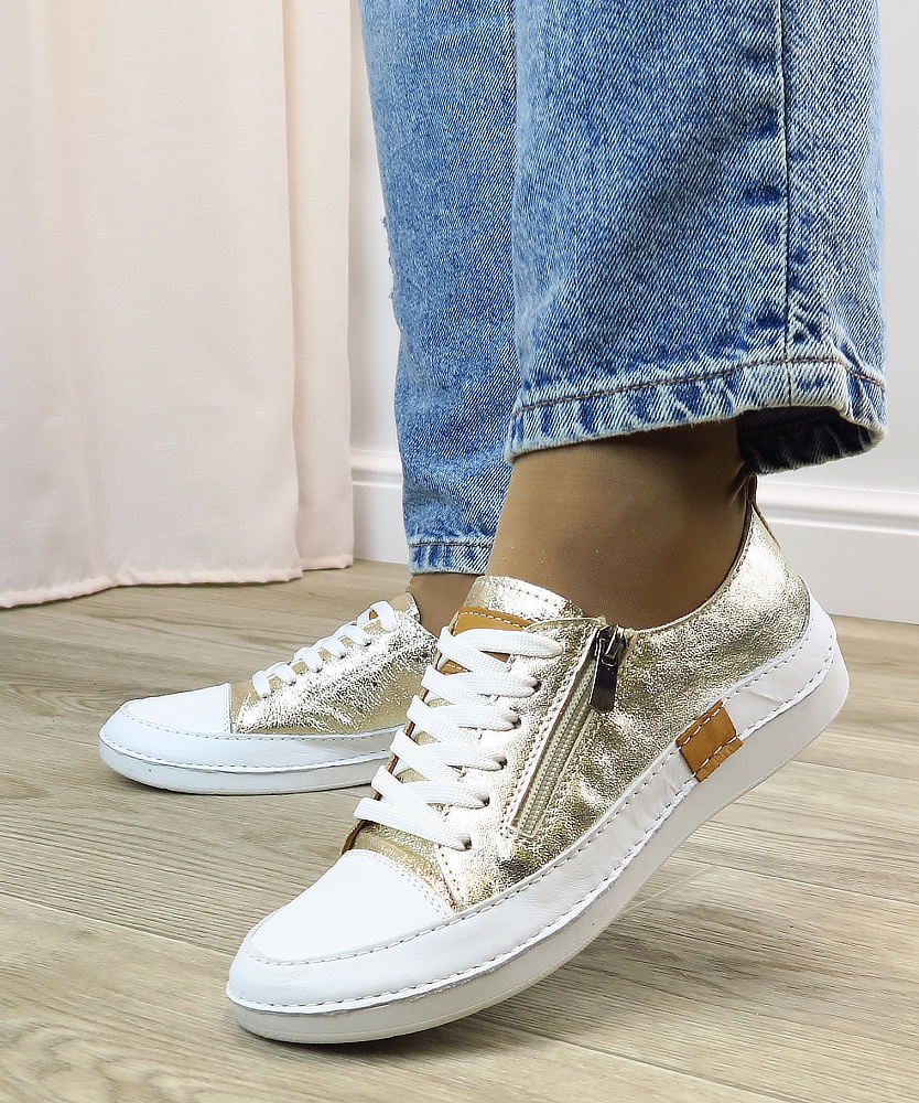 Tieto elegantné tenisky v kombinácii bielej a zlatého metalického odtieňa sú ideálnou voľbou pre ženy, ktoré chcú spojiť komfort s jemným luxusným vzhľadom. Moderný dizajn dopĺňa praktický bočný zips, vďaka ktorému sa topánky ľahko obúvajú a vyzúvajú, zatiaľ čo šnurovanie umožňuje dokonalé prispôsobene chodidlu. Mäkký kožený zvršok a pohodlná podrážka zabezpečujú príjemné nosenie počas celého dňa. Väčší strih – ODPORÚČAME OBJEDNAŤ O ČÍSLO MENŠIE!