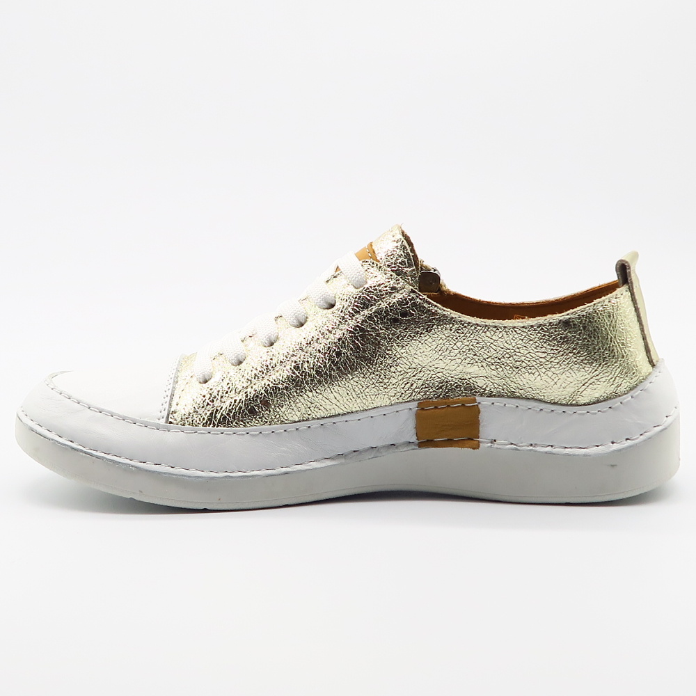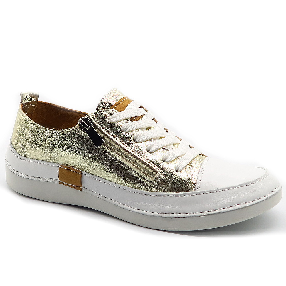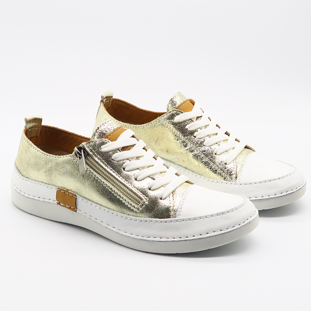 Tieto elegantné tenisky v kombinácii bielej a zlatého metalického odtieňa sú ideálnou voľbou pre ženy, ktoré chcú spojiť komfort s jemným luxusným vzhľadom. Moderný dizajn dopĺňa praktický bočný zips, vďaka ktorému sa topánky ľahko obúvajú a vyzúvajú, zatiaľ čo šnurovanie umožňuje dokonalé prispôsobene chodidlu. Mäkký kožený zvršok a pohodlná podrážka zabezpečujú príjemné nosenie počas celého dňa. Väčší strih – ODPORÚČAME OBJEDNAŤ O ČÍSLO MENŠIE!