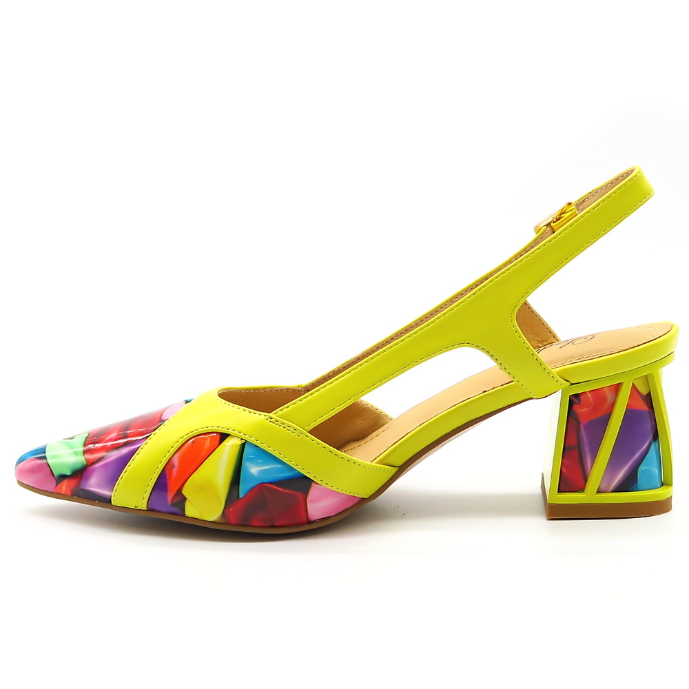 Elegantné dámske sandále značky LADIES. Zvršok vyrobený z ekologickej kože. Model v zaujímavom farebnom prevedení kde dominuje žltá farba. Mäkká kožená stielka zaručí komfortný krok, zatiaľ čo otvorená päta s nastaviteľným ramienkom sa postará o dokonalé prispôsobenie. Stabilný podpätok, ktorý je v modernom štýle zaručuje komfort počas celého dňa aj večera, vďaka čomu sú sandále ideálnou voľbou na spoločenské udalosti, oslavy či elegantné pracovné outfity.