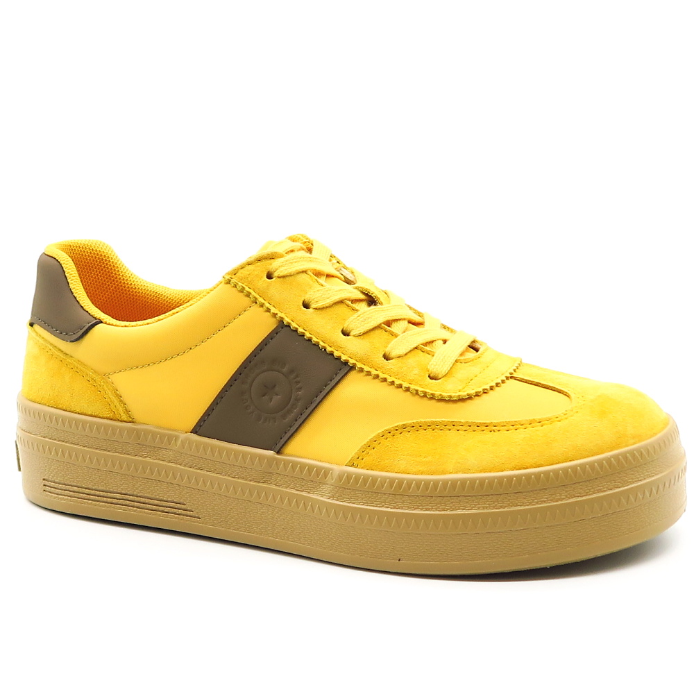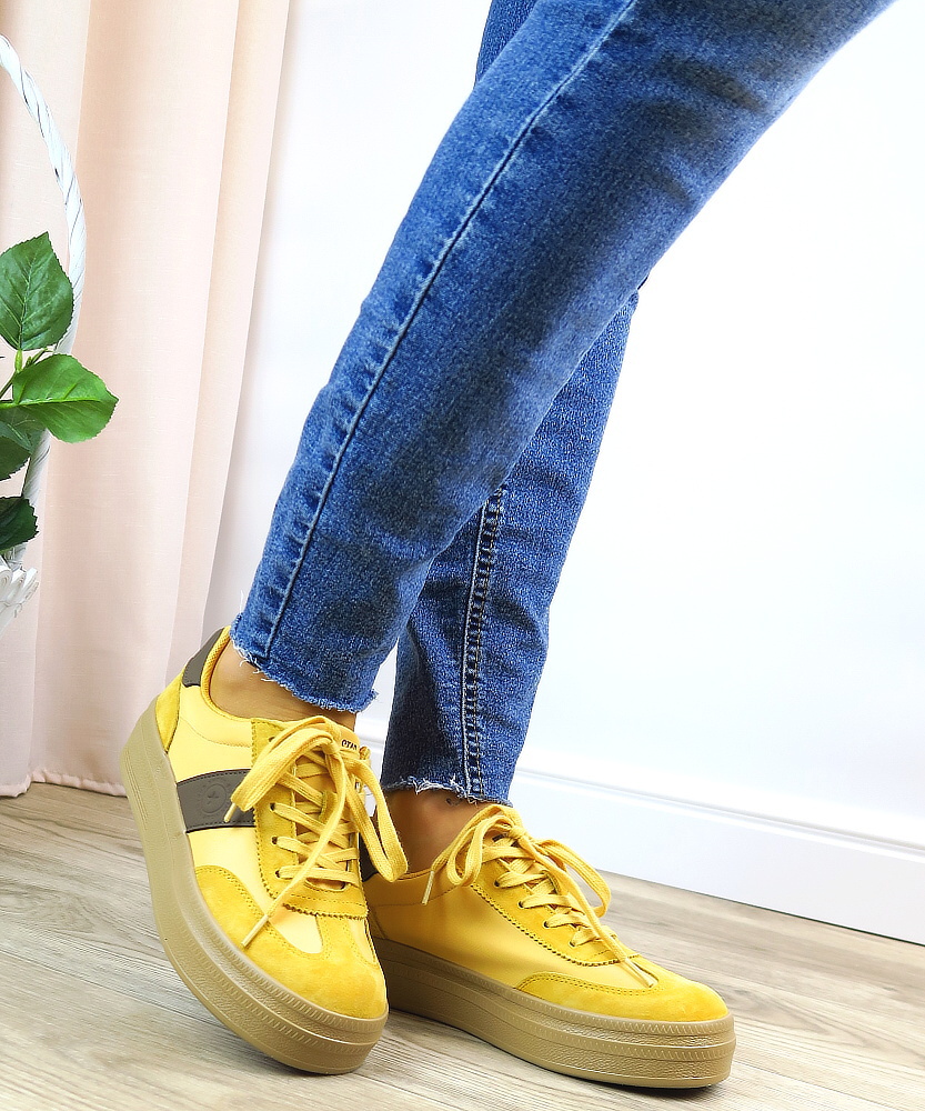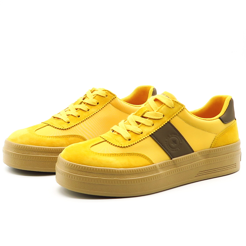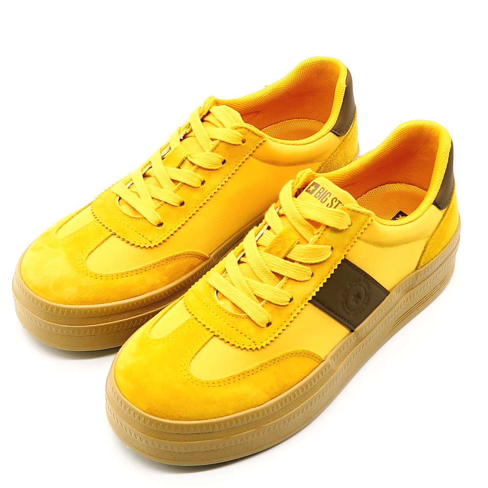 Dámske tenisky značky BIG STAR. Moderný dizajn v žiarivej horčicovo-žltej farbe okamžite upúta pozornosť a dodá každému outfitu svieži, energický nádych. Kombinácia hladkého textilu a jemného semišu pôsobí elegantne, zatiaľ čo kontrastný tmavý pás s logom značky pridáva topánkam charakter a originalitu. Pevná, no pohodlná podrážka v prírodnom odtieni zabezpečuje stabilitu pri chôdzi a celodenný komfort. Ideálne na bežné nosenie – či už do mesta, do práce alebo na voľný čas.