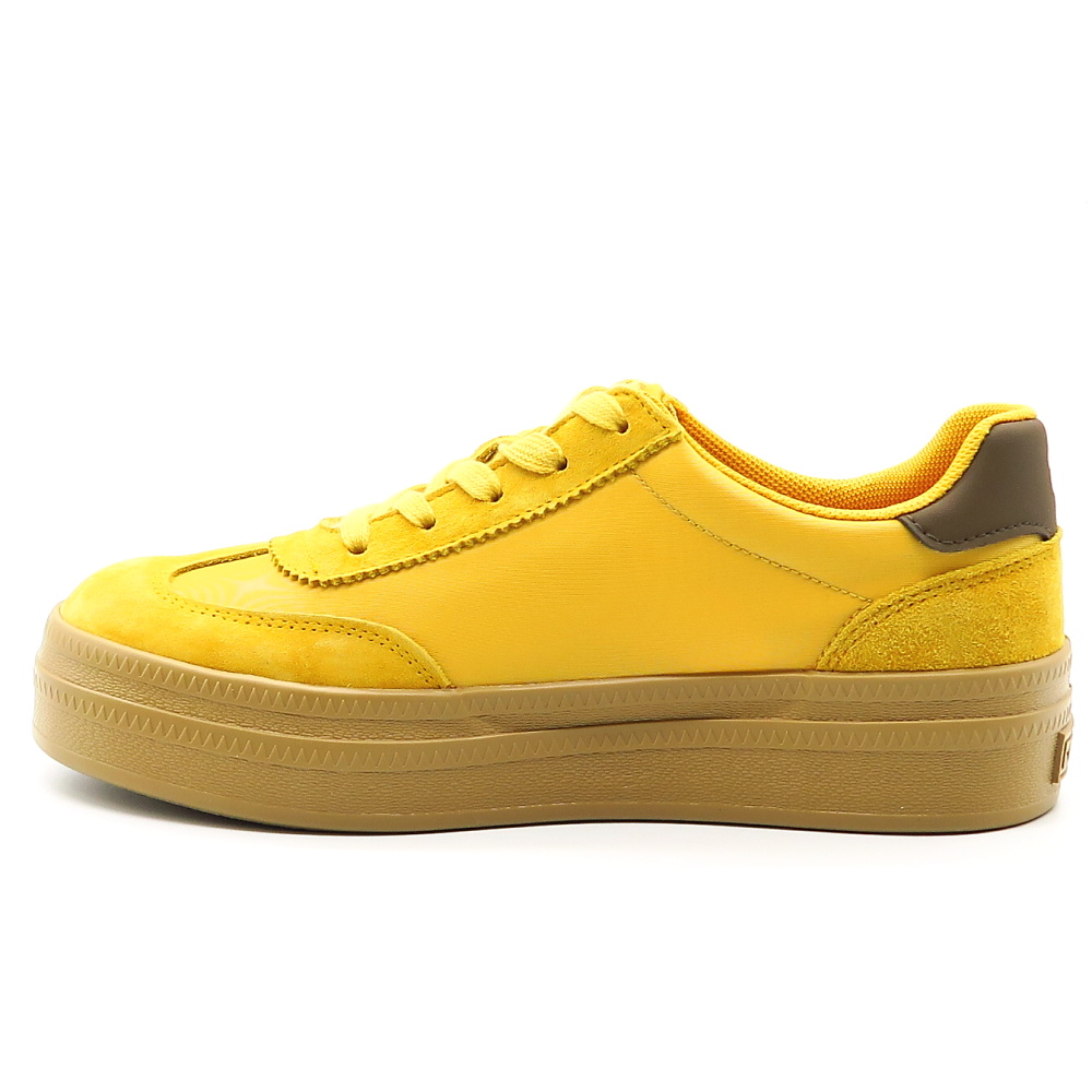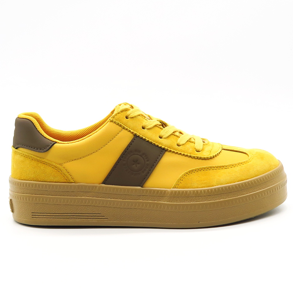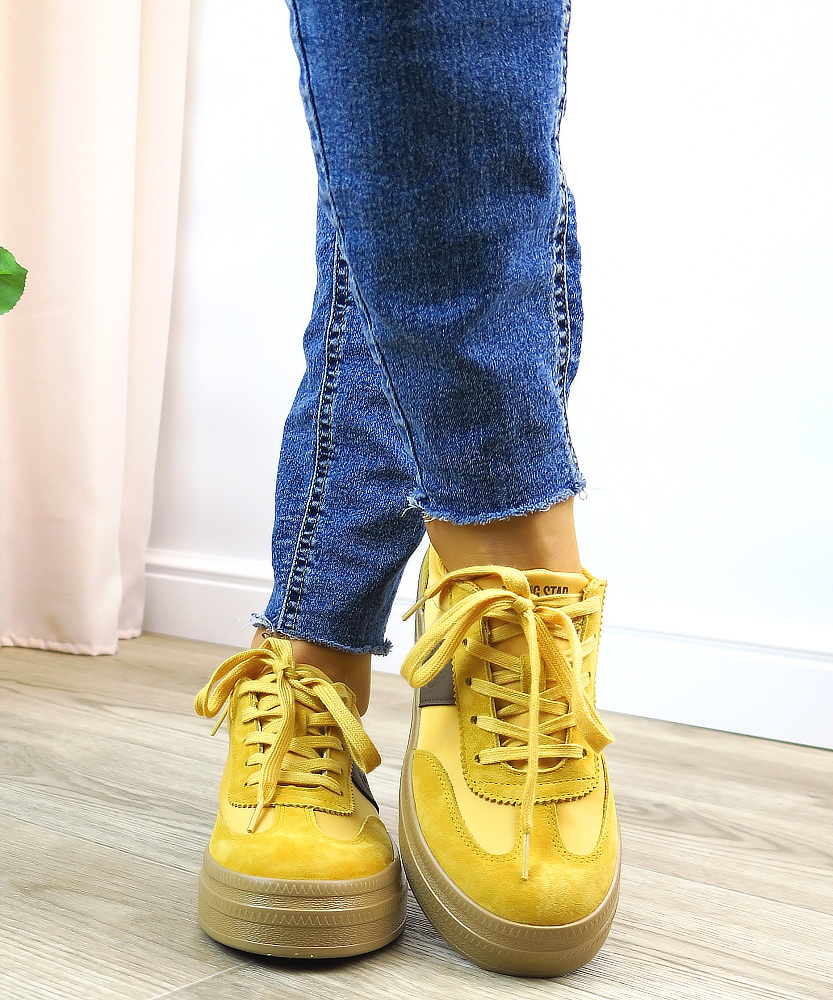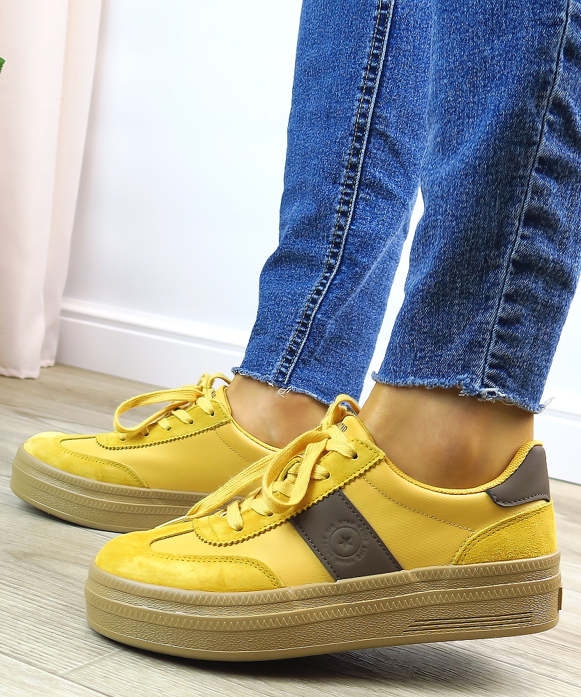 Dámske tenisky značky BIG STAR. Moderný dizajn v žiarivej horčicovo-žltej farbe okamžite upúta pozornosť a dodá každému outfitu svieži, energický nádych. Kombinácia hladkého textilu a jemného semišu pôsobí elegantne, zatiaľ čo kontrastný tmavý pás s logom značky pridáva topánkam charakter a originalitu. Pevná, no pohodlná podrážka v prírodnom odtieni zabezpečuje stabilitu pri chôdzi a celodenný komfort. Ideálne na bežné nosenie – či už do mesta, do práce alebo na voľný čas.